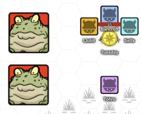 Bancroft and the group returned to town for the night, and back to the same barrow in the morning. They were promptly visited by a pair of giant toads. Selfa ran, and Bancroft watched as Tohru tried her mating call… and found her boyfriend-toad again. The two toads, jealous, fought over Tohru, who fled.