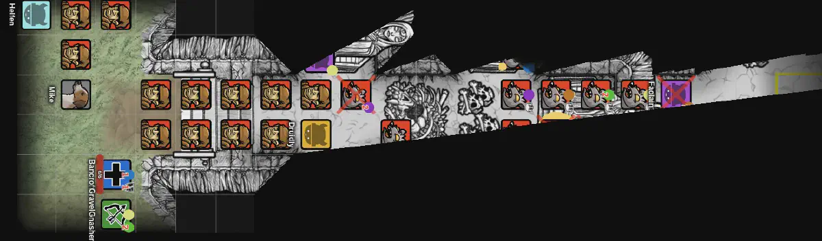 At first, it went according to plan. Bancroft opened the door, Druidly put most of the rats to sleep. Unfortunately, the biggest remained awake, And quickly began to wake his fellow rats. Bancroft rushed past the head rat, then turned and struck a heavy blow from behind. Gravel Gnasher followed up with an arrow that slew the leader, but in the confusion, Faolain had fallen to one of the smaller rats. Whong had too.