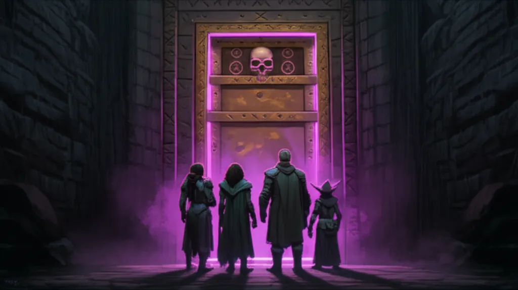 The door was heavy bronze with a skull of Nergal embossed at the top and pentagrams worked into the frame. Old, purposeful. The kind of door someone had built to stay closed. SeaCrock’s Detect Magic fizzled once, then again, then the third attempt lit up the whole door like a coal — strong, deep, the kind of aura that meant whoever had made this had been serious about it.